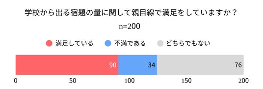 アンケート結果によると、約45%の保護者が学校の宿題の量に「満足している」と回答しており、現在の宿題量を適切と感じている家庭が多いことがわかります。一方で、「不満である」は17%と比較的少数で、大きな不満を抱えている保護者は限定的です。