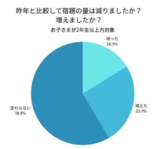 また、夏休みの宿題の量について、「昨年と比べて宿題の量は減りましたか?増えましたか?」という質問を行ったところ、「変わらない」と回答した保護者が58.4%と最も多く、宿題の量に大きな変化は見られなかった家庭が多いことがわかりました。次いで、「増えた」と感じている保護者は25.3%で、約4人に1人が昨年よりも宿題が増えたと認識していました。一方で、「減った」と答えた保護者は16.3%にとどまり、「増えた」と感じた人よりも少ない結果となりました。