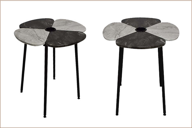 テラス席では9月に展示してから大人気のゴートスツールを引き続き展示しています。9/29のプレスリリースでもご紹介した、クロバー型のダイニングテーブルBF8678(S)とコーディネートしています。