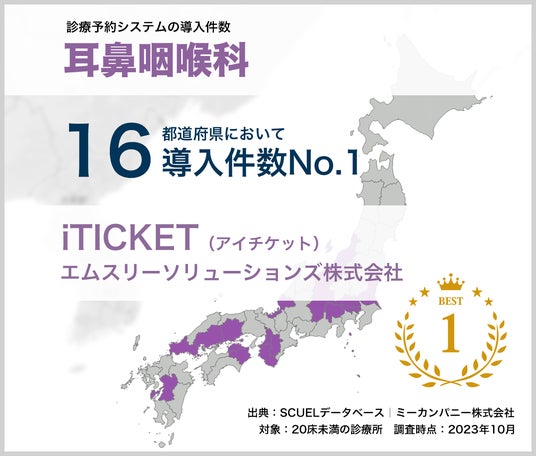 *iTICKET(アイチケット)はエムスリーソリューションズ株式会社の商標です。耳鼻咽喉科耳鼻咽喉科を主とする診療所において、エムスリーソリューションズ株式会社が提供する「iTICKET」が茨城県、埼玉県、東京都、大阪府、岡山県を含む、16都道府県において導入件数が最も多い結果となりました。