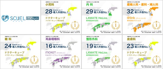 調査・集計方法は、全国の医療機関ホームページをSCUELデータベースを元に独自プログラムにて解析し、外部予約システムへのリンク情報をもとに予約システム名を確認。都道府県別および主たる診療科別に集計したところ、小児科、眼科、皮膚科においてはドクターキューブ(ドクターキューブ株式会社)、内科、整形外科/形成外科においてはLXMATE HeLios(東邦薬品株式会社)、産婦人科/産科/婦人科 においては、@link(株式会社オフショア)が多く導入が多く利用されていることが確認されました。