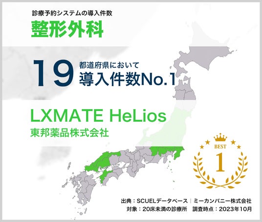 *LXMATE HeLiosは東邦ホールディングス株式会社の商標です。整形外科 / 形成外科整形外科・形成外科を主とする診療所において、東邦薬品株式会社が提供する「LXMATE HeLios」が埼玉県、千葉県、東京都、広島県を含む、19都道府県において導入件数が最も多い結果となりました。