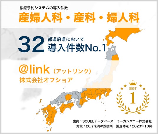 *@link(アットリンク)は株式会社オフショアの商標です。産婦人科/産科/婦人科産婦人科・産科・婦人科を主とする診療所において、株式会社オフショアが提供する「@Link」が北海道、埼玉県、千葉県、東京都、神奈川県、愛知県、福岡県などを含む、32都道府県において導入件数が最も多い結果となりました。