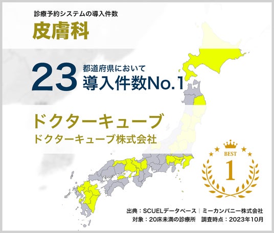 *ドクターキューブはドクターキューブ株式会社の商標です。皮膚科皮膚科を主とする診療所において、ドクターキューブ株式会社が提供する「ドクターキューブ」が北海道、東京都、神奈川県、大阪府、兵庫県を含む、23都道府県において導入件数が最も多い結果となりました。