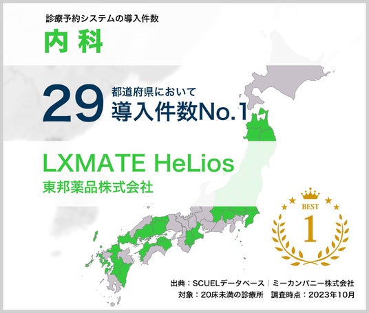 *LXMATE HeLiosは東邦ホールディングス株式会社の商標です。内科内科を主とする診療所において、東邦薬品株式会社が提供する「LXMATE HeLios」が茨城県、栃木県、群馬県、埼玉県、東京都、広島県、福岡県を含む、29都道府県において導入件数が最も多い結果となりました。