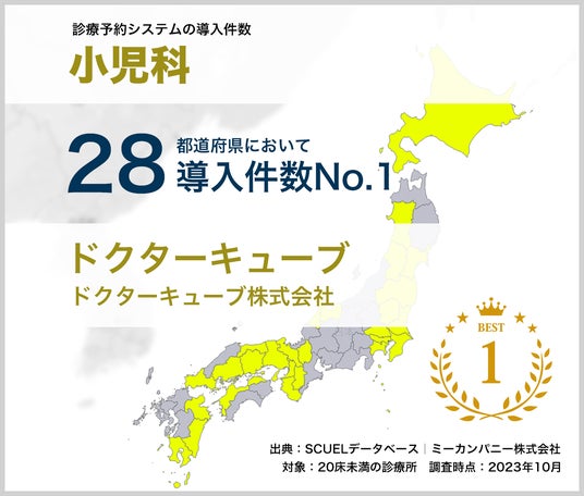 *ドクターキューブはドクターキューブ株式会社の商標です。小児科小児科を主とする診療所において、ドクターキューブ株式会社が提供する「ドクターキューブ」が北海道、東京都、神奈川県、大阪府、兵庫県を含む、28都道府県において導入件数が最も多い結果となりました。