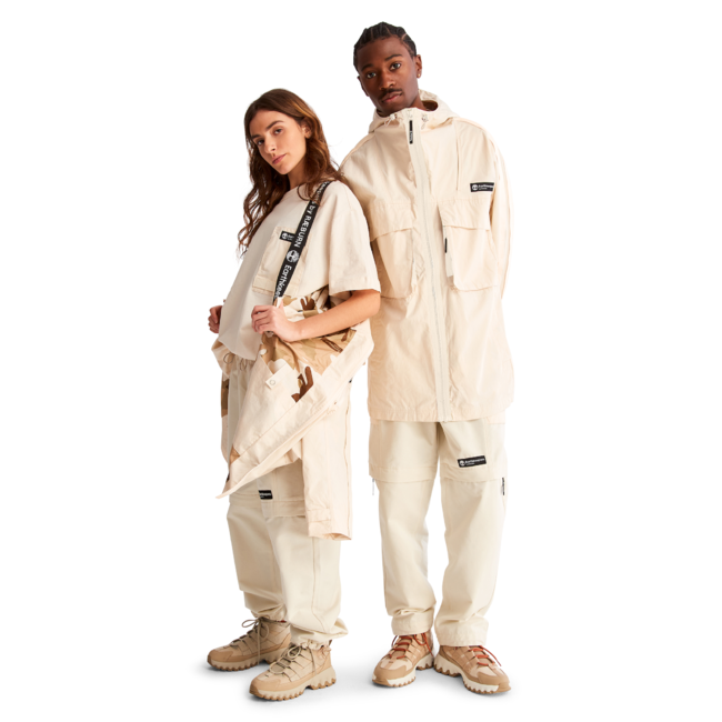 ティンバーランドのコラボレーターとしてクリエイティブ・ディレクションを担うクリストファー・レイバーンは、高い機能性とデザイン性、そして環境への責任・配慮を融合させるという理念をもとに、今シーズンのアウトドア・アドベンチャーに必要な全てのアイテムをデザインしました。ナチュラルカラーを基調にしながらポップなオレンジカラーを配したミニマル・デザインのコレクションは、再生可能なバイオベース素材を使用した「グリーンストライド™ 」コンフォートソール、無染色のマテリアル、リサイクルプラスチックを使用した環境に優しいリボトル™素材のファブリック、責任を持って調達したウッドパルプとリサイクルコットン、Tencel™ x Refibra™ファブリックなど、様々なエコ素材を使用し製造されています。