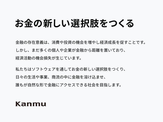 このような金融サービスが行き届いていない社会を、誰もが利用しやすい社会へ。私たちカンムは、お金にまつわる社会課題に対し真摯に向き合うことに決め、個人に限らないより幅広い立場のさまざまな課題を解決するべく、企業としてのあり方を問い直し、ミッションの改定を行いました。