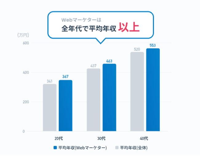 それに伴い、Webマーケターの需要も高まっています。Webマーケターの平均年収はその他の職業と比べて高水準で推移しています。企業で働くだけでなく、副業として個人でクライアントを持つこともできるWebマーケターは、様々な選択肢を取れる職種です。(出典:転職ならdoda(デューダ)https://doda.jp/guide/heikin/gyousyu/#anc_job_08)
