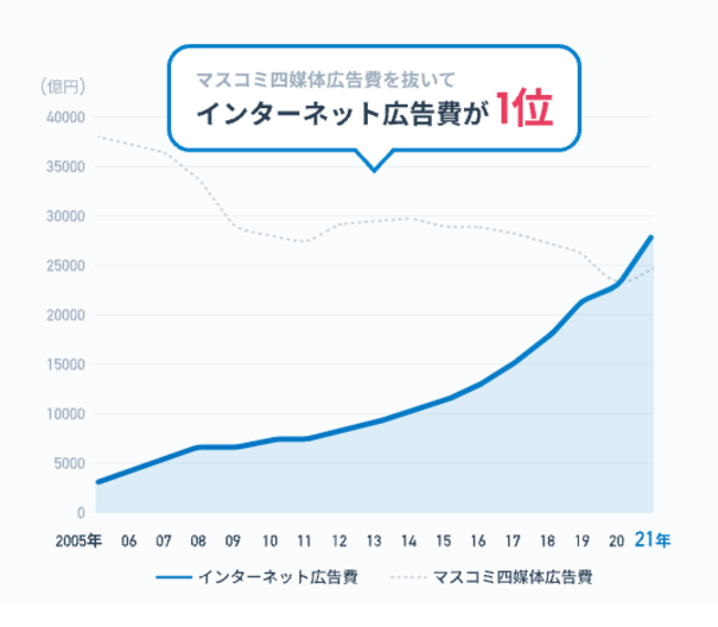 インターネット広告費はコロナ禍においても年々上昇しており、株式会社電通の調査によれば「2021年のインターネット広告費は前年比121%」となっています。(出典元:株式会社電通『2021年 日本の広告費』https://www.dentsu.co.jp/news/release/2022/0224-010496.html)インターネット広告市場は毎年110%以上伸張しており、2021年にはマスコミ4媒体の総広告費を超えました。SNSや動画投稿プラットフォームが主流となってきた中で、今後も大きく成長が見込める市場といえるでしょう。