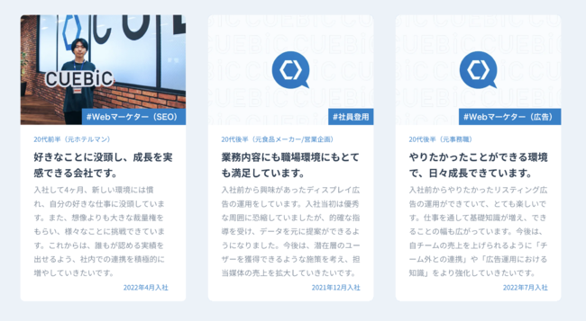 キュービックは「インサイトに挑み、ヒトにたしかな前進を。」をミッションに掲げ、ヒト起点のマーケティング×デザインでビジネスを前進させる会社です。比較サイトを中心としたデジタルメディア事業を行っており、新しい価値を見つける比較サイト『your SELECT.』 https://cuebic.co.jp/your_select/ 、初心者のためのFX比較サイト『エフプロ』 https://www.fx-cube.jp/ 、暮らしをおいしく便利にするウォーターサーバーの比較サイト『ミズコム』https://waterserver-mizu.com/ 、「もっといい求人」を探す人のための転職支援サイト『HOP!ナビ(ホップナビ)』 https://www.hop-job.com/ などを運営しています。フィールドワークを重視し、表面的なニーズではなくインサイト(深層心理)を的確に捉え、人々をよりスムーズな課題解決体験へと導いています。