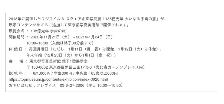 FUJIFILM SQUARE(フジフイルム スクエア)では、2020年11月27日(金)から12月17日(木)まで、FUJIFILM SQUARE企画写真展「ハッブル宇宙望遠鏡 宇宙の神秘を紐解く30年」を開催いたします。