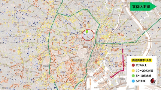 今回はこのエリアの中から、価格の高騰率が5%未満(青色プロット)のエリアをランダムに取り出して、そのエリアの中でも価格が高騰しやすいマンションの特徴を調査しました。