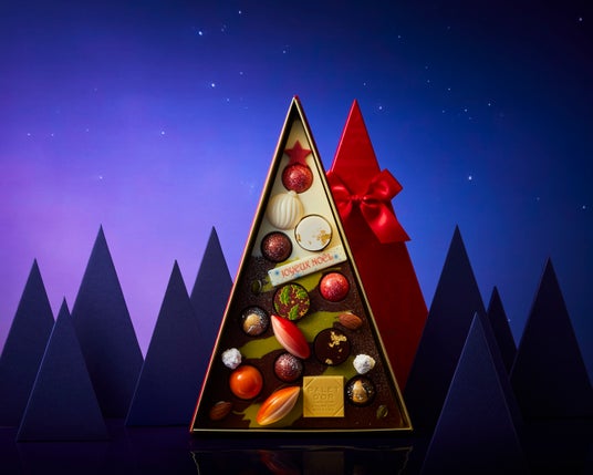 2024年バージョンは、アーモンドやヘーゼルナッツなどを使ったプラリネや、ドイツ伝統菓子シュトレンをイメージして作られたショコラなどを、色鮮やかに輝くツリーのオーナメントに見立て、自家製チョコレートで作られた土台まで丸ごと食べられるチョコレートツリーに仕上げました。