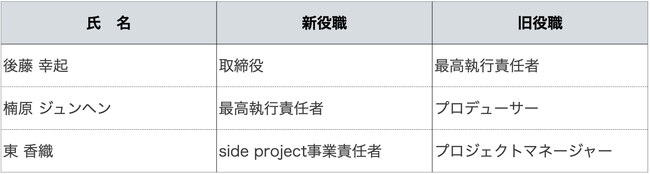 株式会社ローンディール(東京都港区、代表取締役:原田未来)は、今後の事業拡大を見据え、経営体制を変更いたします。当社の取締役はこれまで代表の原田未来1名となっておりましたが、最高執行責任者の後藤幸起が2023年7月1日付で取締役に就任しました。これに伴い、最高執行責任者にはプロデューサーの楠原ジュンヘンが着任します。また、2023年5月に発表をした新事業「side project(サイドプロジェクト)」の事業責任者として東香織が就任したことも併せて発表いたします。