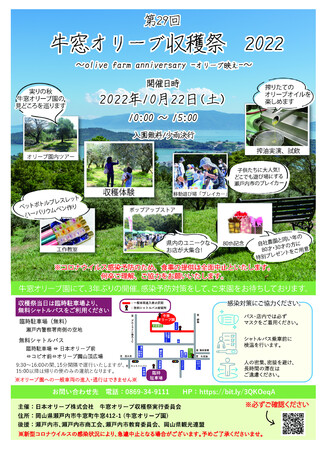 オリーブ栽培とオリーブの木・食品・化粧品の製造販売を手掛ける日本オリーブ株式会社(所在地:岡山県瀬戸内市牛窓町、取締役社長:服部芳郎)は2022年10月22日(土)に瀬戸内海を一望できる自社牛窓オリーブ園にて、第29回牛窓オリーブ収穫祭2022「Olive Farm Anniversary ~オリーブ映え~」を開催いたします。