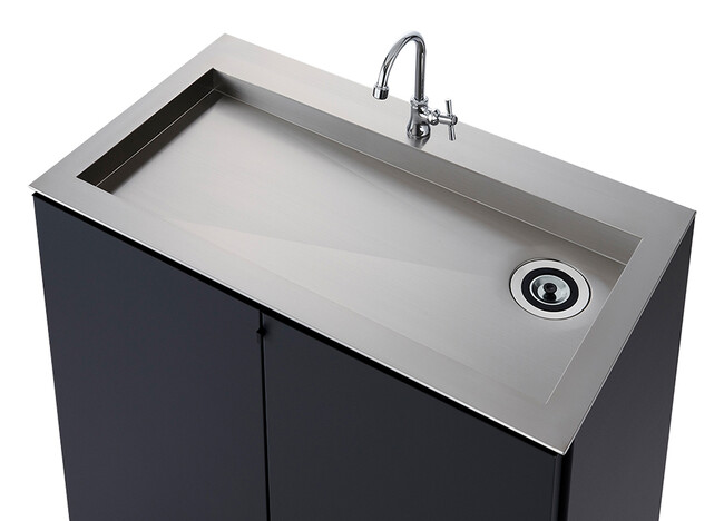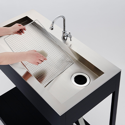 凹凸のないノイズレスなデザインのため、アウトドア空間に自然に溶け込みます。家具のようにスリムな脚はアジャスター付きのため、設置の際に調整することが可能で、極限まで見付けを薄くしたシンクの天板がスタイリッシュさを際立たせます。
