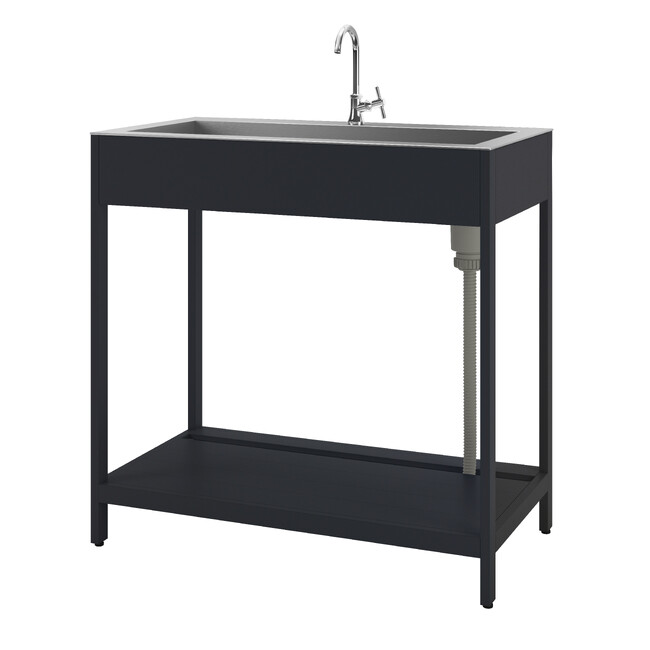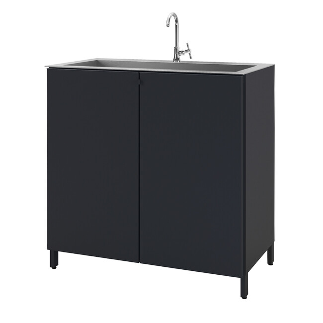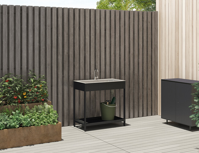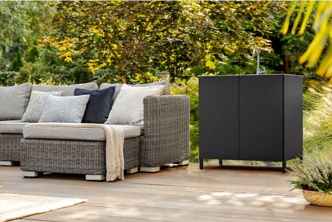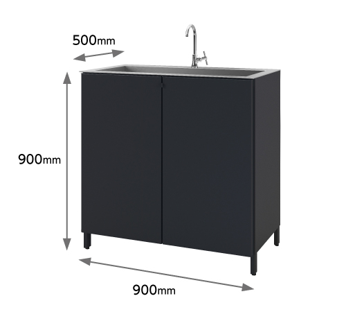 シンク下の収納スペースは、オープンと扉付きの2タイプからお選びいただけます。さまざまなエクステリア空間に合わせやすいカラーであるマットブラックをご用意しております。家具のような脚付きなのでガーデンファニチャーとも調和します。