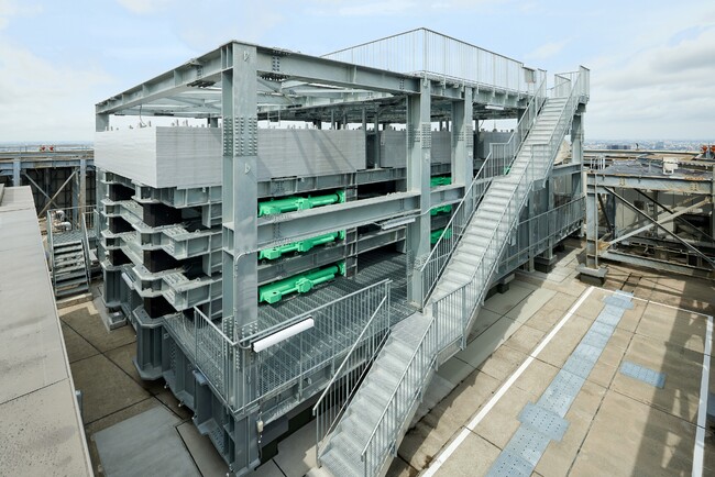 このたび設置した「D3SKY-L」は、鹿島が開発した多段積層ゴム式の大地震対応の大型TMDで、専用開発の積層ゴムを用いた3段構成として装置高さを低く抑えた仕様になっています。また、錘重量450t(許容ストローク1.5m)のTMD を3基連結した構成とすることで大幅な省スペース化を実現し、従来ヘリポートとして利用されていた屋上の限られたスペースへの設置を可能としました。工事の影響も屋上と最上階の機械室エリアのみに限定できたため、工事期間中もオフィス・レストラン街は通常通りの営業を続けることができました。