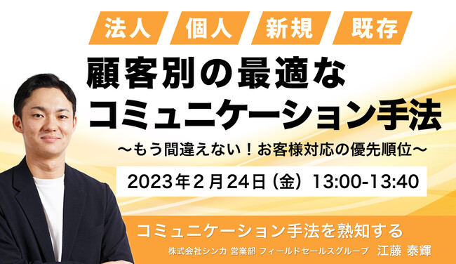 クラウド型コミュニケーション管理ツール「カイクラ」の開発・販売を行う株式会社シンカ(本社:東京都千代田区、代表取締役社長 江尻高宏、以下、「シンカ」)は、無料オンラインセミナー「顧客別の最適なコミュニケーション手法を解説します」を2023年2月24日(金)に開催いたします。