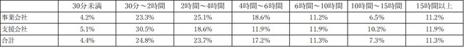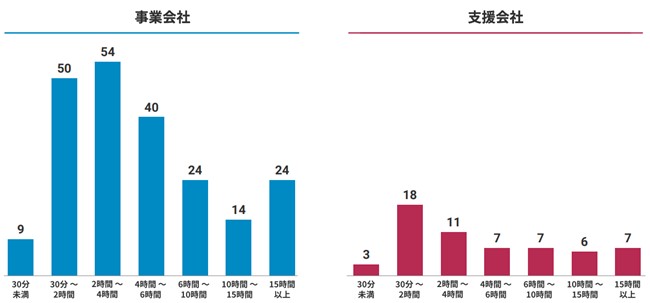 事業会社では【2時間~4時間】が25.1%、支援会社では【30分~2時間】で30.5%が最も多い。