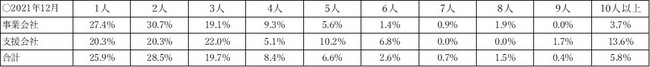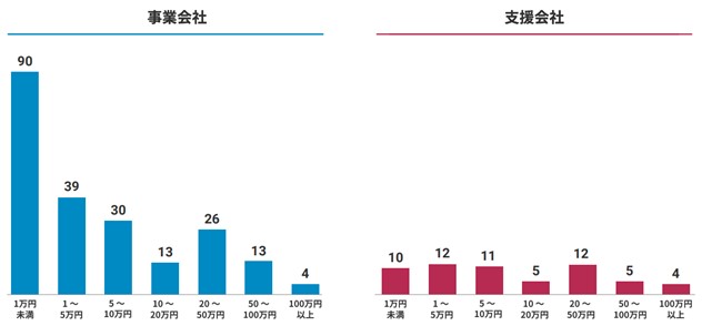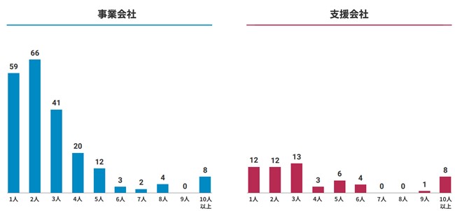 また2021年調査だと事業会社は【2人】、支援会社は【3人】が最も多く、全体でも【2人】が28.5%で最多となった。事業会社では1~3人が全体の約8割を占め、少人数での運営を行っていることが分かった。また、全体の5.8%は、【10人以上】が運用に関わっていることも分かった。