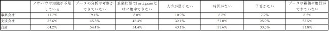 【ノウハウや知識が不足している】が64.2%と課題意識が最も大きい。次いで【データの分析や考察ができていない】・【兼業状態でInstagramだけに集中できない】が54.4%となった。