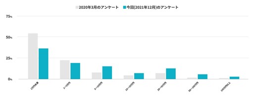 ・Instagramにかける月の予算について、【50,000円以上】は、2020年3月の22,2%に対して2021年12月は43,5%と約倍増。【100,000円以上】だと2020年3月は14.3%に対して2021年12月の調査だと28.1%とこちらも約倍増となり、Instagramにかける予算は増えていることが分かった。