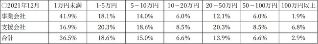 また2021年調査だと事業会社の予算は【1万円未満】が41.9%と圧倒的に多く、全体的でも【1万円未満】が36.5%と最多。また、全体の2.9%は【100万円以上】の予算を持っていることが分かった。