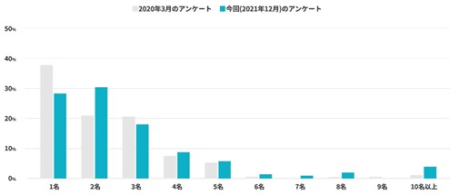 【5人以上】は、2020年3月の8,2%に対して2021年12月は17,7%と倍増。【3人以下】だと2020年3月は82.9%に対して2021年12月は74.2%となり、3人以下での運用の割合は高いが、徐々に多くの人員をInstagramの運用に回すようになっていることが分かった。
