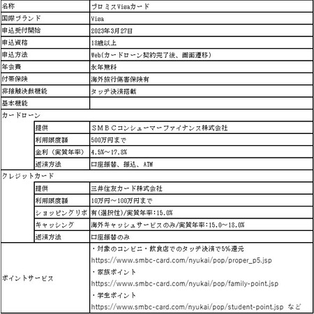 SMBCコンシューマーファイナンス株式会社(本社:東京都江東区、社長:金子 良平、以下:サービスブランド「プロミス」)と三井住友カード株式会社(本社:東京都江東区、社長:大西 幸彦、以下:三井住友カード)は、2023年3月27日(月)より、プロミスのカードローンと三井住友カードのクレジットカード機能が1つになったカード、「プロミスVisaカード」(以下、本カード)の発行を開始します。