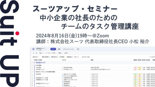 株式会社スーツ(所在地:東京都千代田区、代表取締役社長CEO:小松 裕介)は、2024年8月16日(金)19時から、当社代表の小松が講師を務めるスーツアップ・セミナー「中小企業の社長のためのチームのタスク管理講座」を無料開催します。