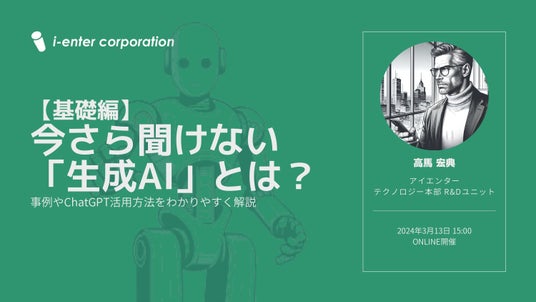 株式会社アイエンター(本社:東京都渋谷区、代表取締役:入江 恭広)は、2024年3月13日(水)にオンライン配信にて『【基礎編】今さら聞けない「生成AI」とは?事例やChatGPT活用方法をわかりやすく解説』ウェビナーを開催します。