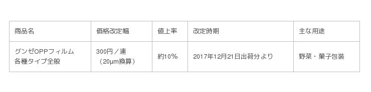 グンゼ株式会社(本社:大阪市北区、社長:廣地 厚)は、プラスチックカンパニーが販売するOPP(二軸延伸ポリプロピレン)フィルムについて、2017年12月21日出荷分より価格改定(値上げ)することを決定しましたので、お知らせいたします。