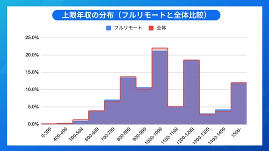 フルリモート可能な求人と全体を下限年収で比べたところ大きな変化はなく、フルリモート求人の方が1400万円台などがやや高い傾向となりました。