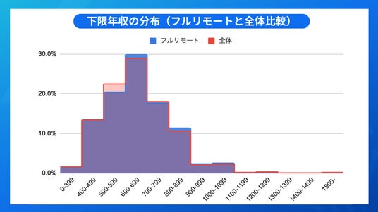 フルリモート可能な求人と全体を下限年収で比べたところ、フルリモート求人の方が600万円台や800万円台がやや高い傾向となりました。