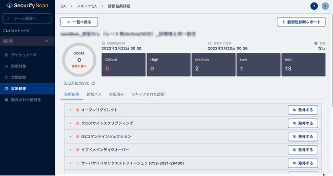 診断結果は画面に出力され、脆弱性の概要解説、該当箇所の修正方法の提案、トリアージに必要な情報を提供いたします。