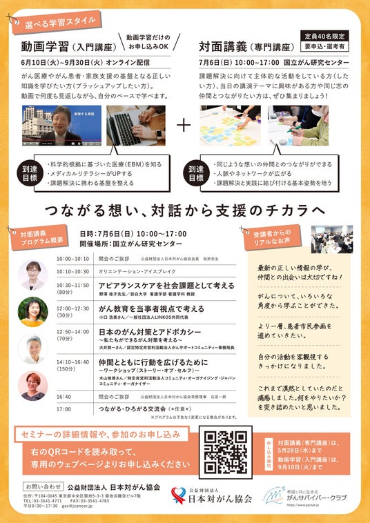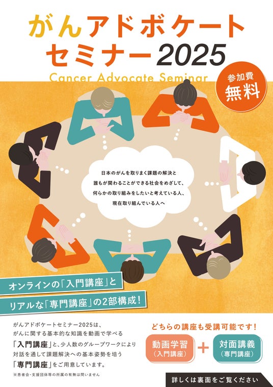 公益財団法人日本対がん協会(東京都中央区、会長 垣添忠生・国立がんセンター名誉総長)は6月より、「がんアドボケートセミナー2025」 を開催します。日本のがんを取りまく問題に何らかの形でかかわりたいと考える方が、がんに関する知識を学び、ご自身の次のアクションに繋がるヒントを見つけ活力を得られる場を目指します。