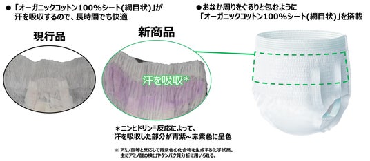 そこでこのたび、大人用排泄ケアブランド 売上No.1※の『ライフリー』から、おなか周りに「オーガニックコットン100%シート(網目状)」を搭載した『ライフリー うす型軽快パンツ Organicコットンタッチ』を発売します。