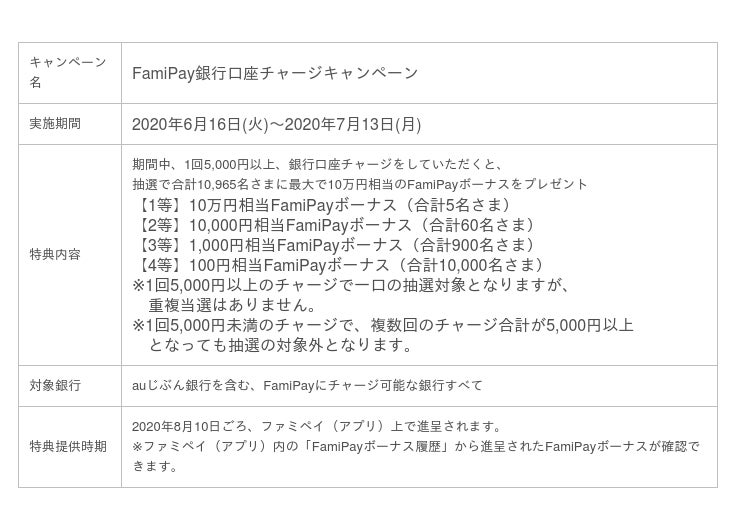 ~1回5,000円以上の銀行口座チャージで、最大10万円相当のFamiPayボーナスが当たる~