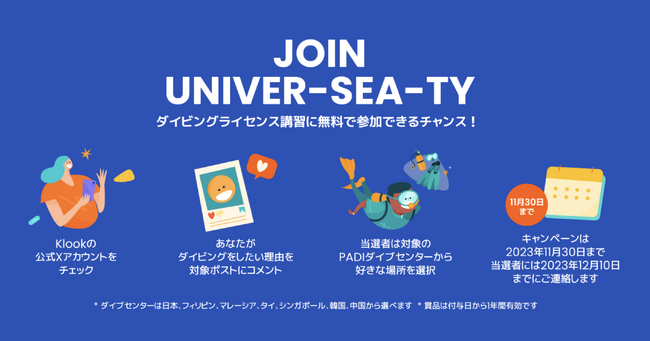 X(旧Twitter)でKlookの投稿にコメントであなたがダイビングをしたい理由を教えてください。当選者には、2023年12月にDMを通じて通知され、オープン・ウォーター・ダイビング認定プログラムを予約するための350米ドル相当のKlook eギフトカードが贈られます。詳細はKlookの公式Xアカウント(@klookjp)及びキャンペーンページをご覧ください。