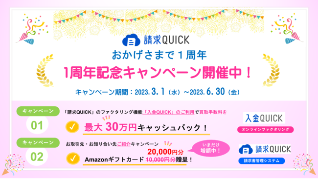 「請求QUICK」は2023年3月にサービス提供開始から1年を迎えました。おかげさまで2,000社を超える企業様に継続利用のお申し込みをいただき、多くのお客さまからご好評をいただけるサービスになりました。「請求QUICK」をご利用いただいているお客さまへの感謝の思いと、かんたん・便利なオンラインファクタリング「入金QUICK」のご紹介を兼ねて「請求QUICK 1周年記念キャンペーン」を6月末まで開催中です。