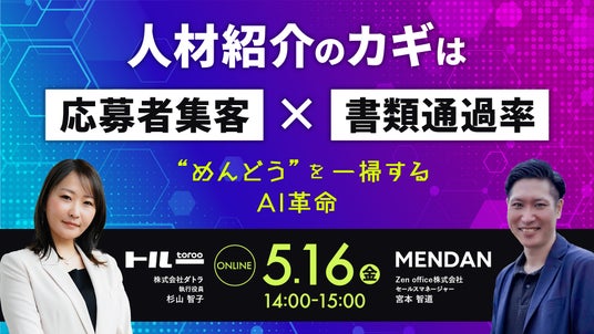 採用マーケティングATS「トルー」を運営する株式会社ダトラ(本社:大阪市中央区、代表取締役:草深悠介)は、Zen office株式会社(本社:大阪市中央区、代表取締役:岩瀬恭裕)との共催で、2025年5月16(金)、【人材紹介のカギは応募者集客×書類通過率 ”めんどう”を一掃するAI革命】をテーマに、無料オンラインセミナーを開催いたします 。