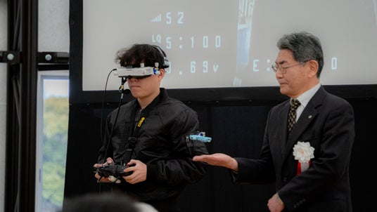 手のひらサイズのドローン(Tiny)でのデモンストレーションも行われ、学長の掌の上に着地するパフォーマンスも行われた