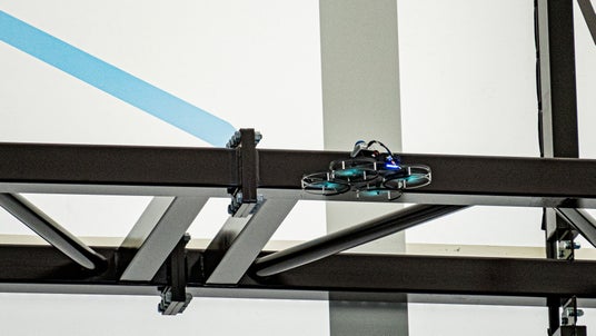 DXフィールドの鉄骨に接近しての目視点検デモ/今後ドローンにどのような活躍が期待されるか、ナレーションの説明とともに実演された