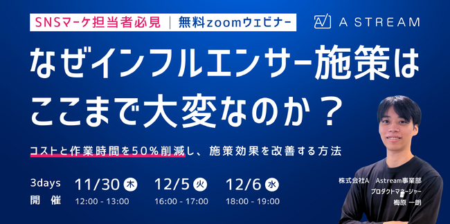 株式会社A(読み:エース、代表取締役CEO 中嶋泰、以下「当社」)が提供するSNSマーケティングツール「Astream(エーストリーム)」は、11/30(木)、12/5(火)、12/6(水)の3日程で「なぜインフルエンサー施策は ここまで大変なのか?~コストと作業時間を50%削減し、施策効果を改善する方法~」をテーマに、無料ウェブセミナーを開催いたします。
