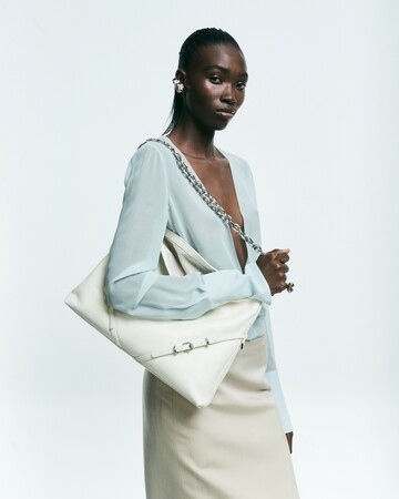 ジュエリーようなメタル・リンクの特徴的なダブルチェーンストラップは、長いシングルストラップへと優雅に変化させることで、シーンに応じて肩掛け、クロスボディといった使い分けを可能にします。サイズはミディアムのみの展開で、タンブルレザーのクラシックなブラックとアイボリー、ラミネートレザーのシルバーグレー、ウォッシュドデニムのミディアムブルーなど、多彩なカラーバリエーションが揃います。ゆったりとしたメインコンパートメントの内側には、鍵やウォレットなどのエッセンシャルアイテムの収納に最適なジップポケットが付いています。外側には「V」ラインのコーナーストラップがあり、荷物のボリュームに合わせて調節が可能です。フロントにさりげなくエンボスされた「GIVENCHY」のシグネチャーが、今どきのファッション・ステートメントを完成させています。