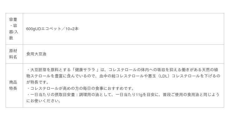 総コレステロールや、LDLコレステロールを下げる油(特定保健用食品)です。大豆胚芽たっぷりの原料を使用し、揚げものや炒めものをはじめ、どんなお料理にもお使いいただけます。