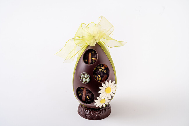 パスカルカラーのリボンをまとわせたビターチョコレートのたまごの中にオレンジピール、レーズン、ピスタチオをのせたマンディアンが入っており、ボリュームと満足感があります。