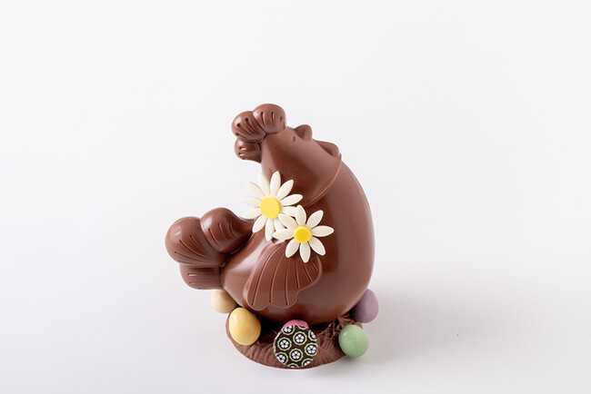 お花を飾ったミルクチョコレートの可愛らしいにわとりの中にドライパイナップル3個と魚の形のフリチュールが3個入っています。
